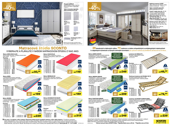 2) 2 za cenu 1 na matrace, rošty a toppery. Platí iba pri nákupe dvoch rovnakých matracov, roštov alebo topperov. Pri jednom z produktov zaplatí zákazník Bežnú cenu a druhý získa zadarmo. Zľavy sa počítajú z Bežných cien a možno ich využiť iba pri tovare, pre ktorý bola stanovená klubová SCONTO cena. Akcia platí iba pre členov SCONTO Clubu. Členstvo v SCONTO Clube je zadarmo a bez záväzkov. Členské výhody možno čerpať okamžite, už pri prvom nákupe. Nevzťahuje sa na služby, tovar označený ako Výpredaj alebo Cenový hit. Akcia platí 26. 11.- 14. 12. 2025.
